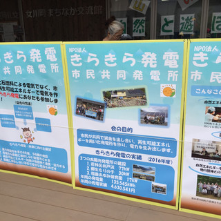 阿部美紀子さんたち「夏の文化祭」実行委員会の協力で、NPO法人おながわ・市民共同発電所も、まちなか交流館の玄関前で、仙台で活躍している「きらきら発電所」の皆さん、プロジェクト宇佐美さんたちと一緒に、展示コーナーを設けることが出来ました。